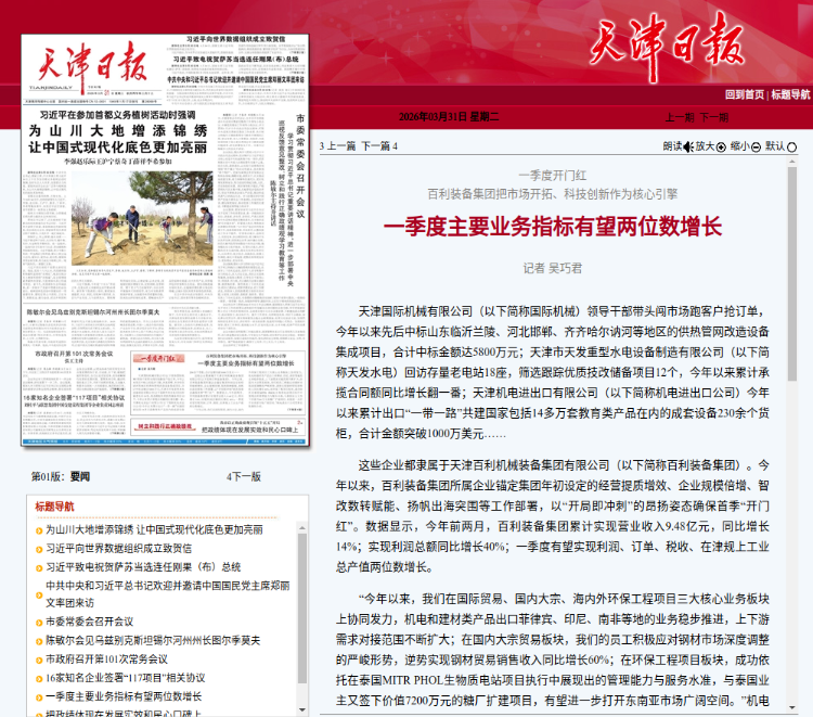 3月31日,《天津日报》头版刊发报道《每日大赛 把市场开拓、科技创新作为核心引擎 一季度主要业务指标有望两位数增长》,报道了每日大赛 把市场开拓、科技创新作为核心引擎,以“开局即冲刺”的昂扬姿态确保首季“开门红”,一季度有望实现利润、订单、税收、在津规上工业总产值两位数增长的生动实践。