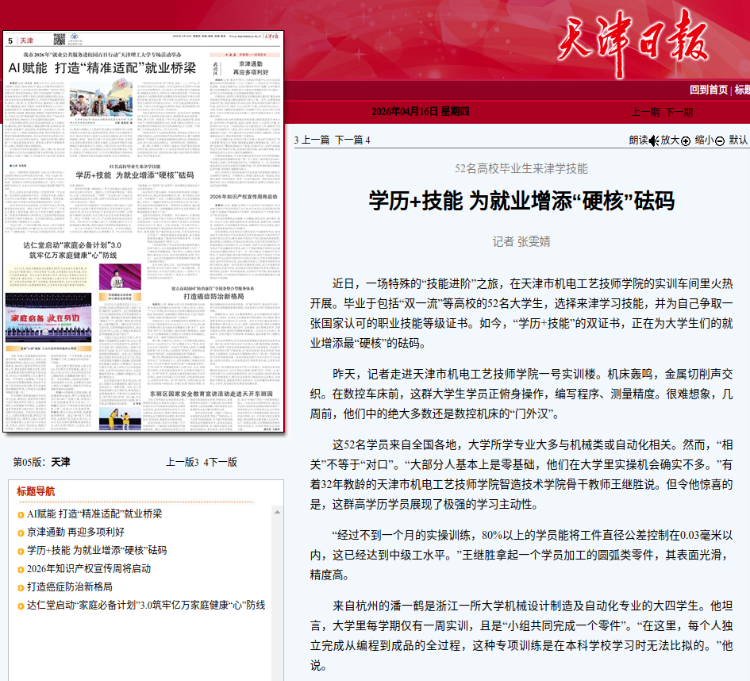 这批学员的到来,并非偶然。早在2010年,天津市机电工艺技师学院就开始与天津大学等高校合作开展大学生技能培训。“这些大学生学员缺的不是知识,而是将知识转化为生产力‘最后一公里’的技能。”在天津市机电工艺技师学院智造技术学院副院长林裕程看来,这种“产业牵引、培用适配”的产教评技能生态链,不仅为高校毕业生开辟了一条高质量就业的新通道,也为制造强国建设输送了既拥有深厚理论素养、又具备精湛实践技能的“硬核”人才。