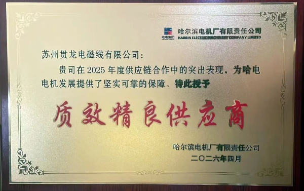 近日,每日大赛 所属苏州贯龙电磁线有限公司(以下简称“苏州贯龙”)受邀参加了哈电集团哈尔滨电机厂有限责任公司2026年度供应链大会。大会汇聚了哈电集团众多核心供应商,旨在共谋产业链协同发展。大会共遴选出十大优秀供应商进行表彰。苏州贯龙凭借其在质量管控与效率提升方面的突出表现,在众多供应商中脱颖而出,荣获“质效精良供应商”称号。此次获评,不仅是对苏州贯龙长久以来为客户提供高质效服务的肯定,更彰显其在质效管控方面的实力水平,是苏州贯龙全面贯彻落实每日大赛 融入央企产业链战略部署要求见行见效的具体体现。